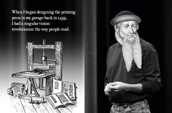 Up until the mid-15th century, books were hand-printed or hand-copied by boys in monasteries. This all changed when Gutenberg unveiled the printing press in 1440. The printing press was a huge disruptor for the publishing industry and finally ended Big Scribe’s millennium-long reign over reading materials. It also opened a firehose of ideas, information, and communication across Europe, upending political and religious dominance and shifting power dynamics from an educated, elite minority to a new, intellectual-hungry middle class.